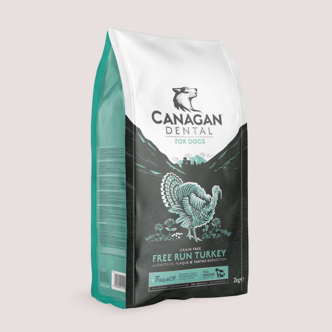 Canagan Turkey Dental Dry Dog Food is a grain-free dog food formulated to reduce plaque, tartar and bad dog breath. Contains ProDen PlaqueOff®, a clinically proven anti-plaque remedy approved by the Veterinary Oral Health Council. Canagan Dental range uses the world’s most effective anti-plaque remedy in a delicious dry dog food that satisfies your pet’s instincts and cleans their teeth.