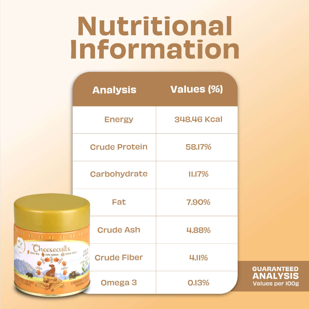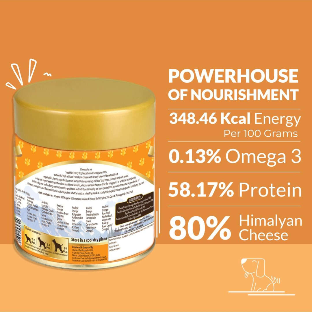 Pawfect Cheesecuits Cheese Dog Biscuits With Pumpkin & Flaxseed are a wholesome, tasty treat crafted with simple, premium ingredients. Made with Himalayan cheese and blended with nutritious pumpkin, flaxseeds and eggs, these biscuits provide natural goodness in every crunchy bite.
