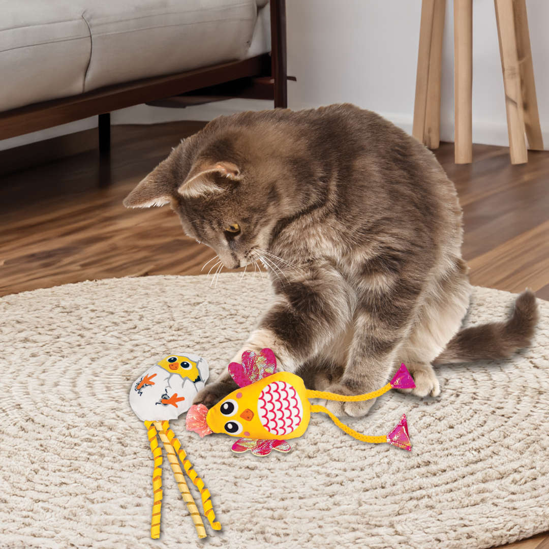 Filled with premium KONG North American catnip, the toy helps attract your cat’s attention and encourages longer play sessions. The soft plush texture combined with crinkle sounds adds extra excitement, making the Scrattles Chicken an engaging toy that cats will love to chase, kick and cuddle.