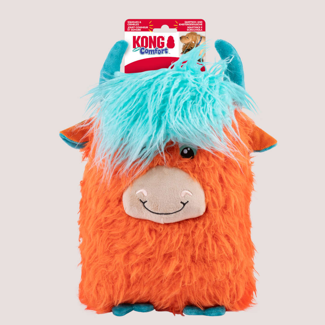 Whether used as a bedtime buddy or a daytime comfort toy, the KONG Comfort Highland Cow Jumbo delivers soothing softness and trusted KONG quality.