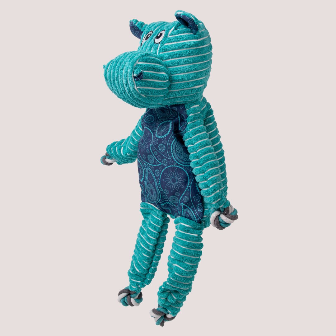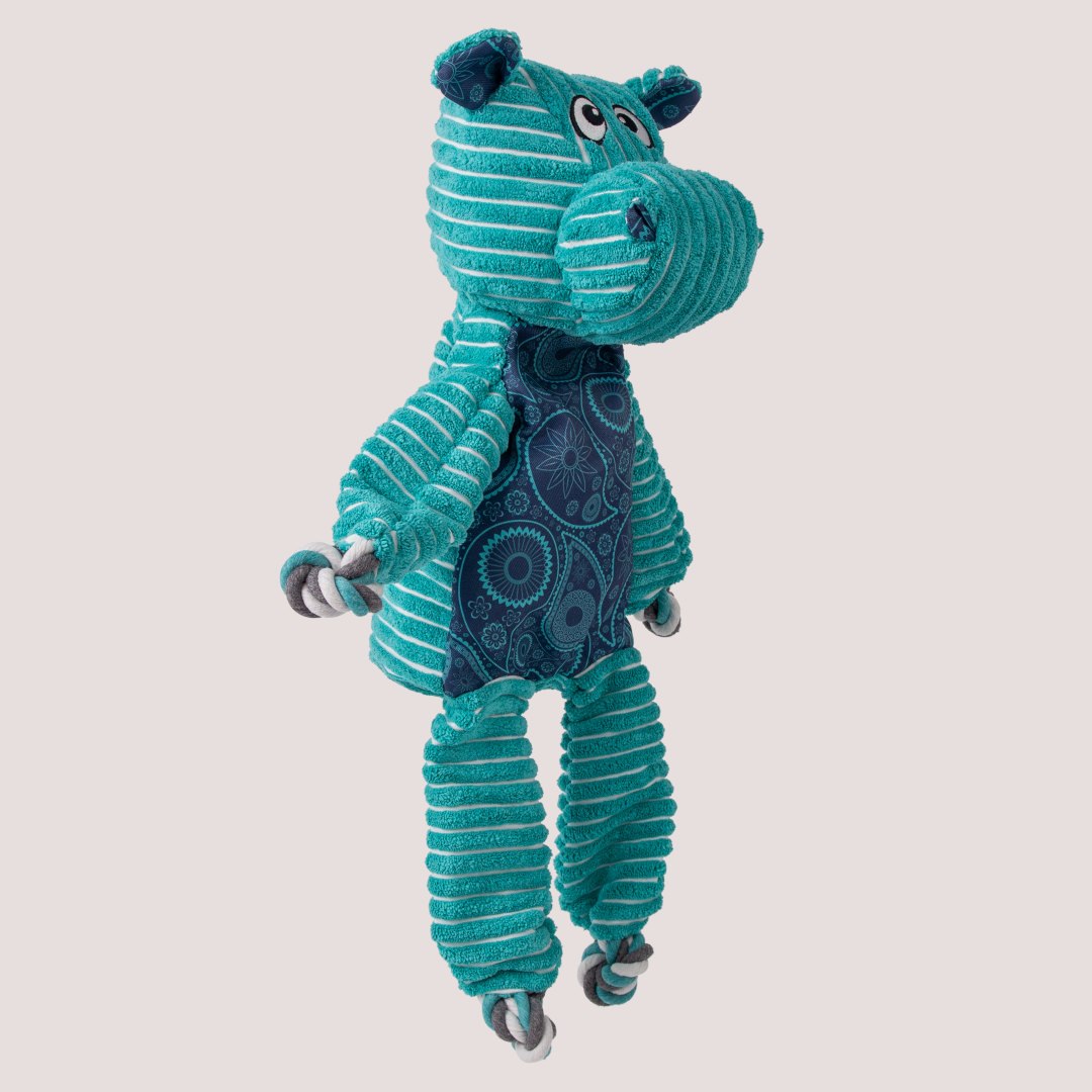 • Oversized plush hippo toy with internal knotted rope for realistic play