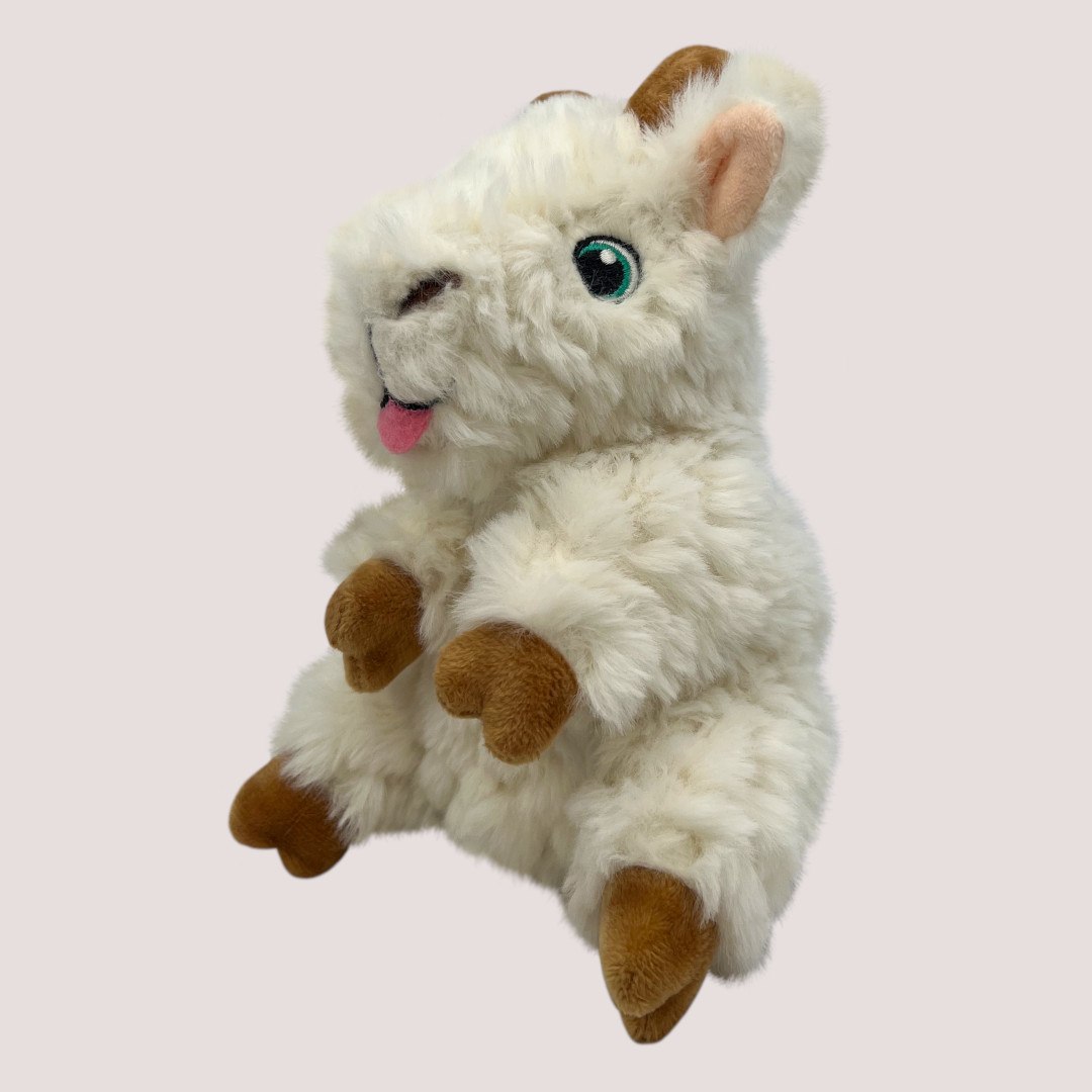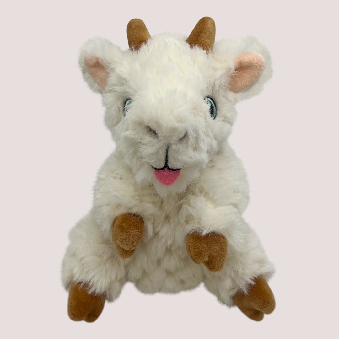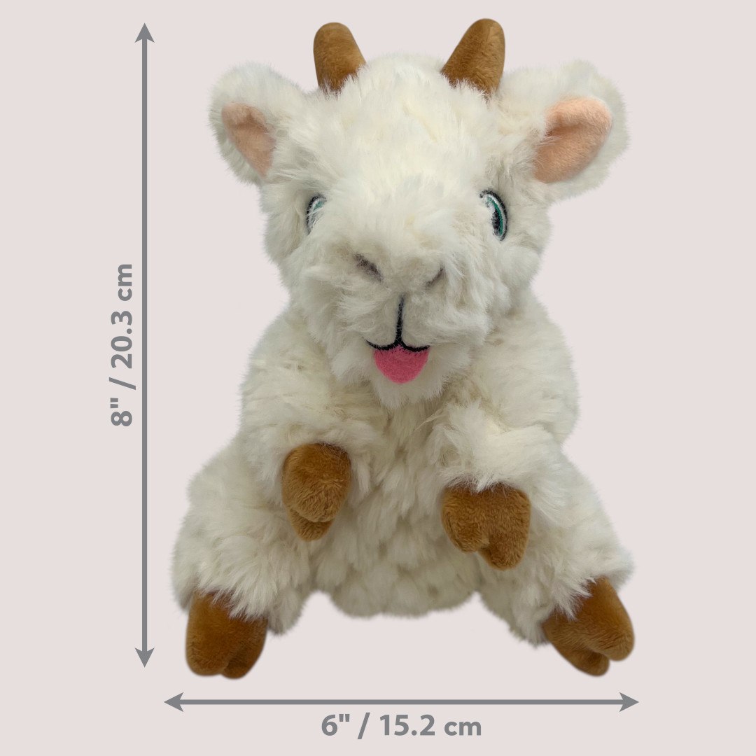 KONG Tykes Goat is a small, plush, squeaky toy with reinforced durability, perfect for puppies and small dogs who enjoy cuddly, gentle play.