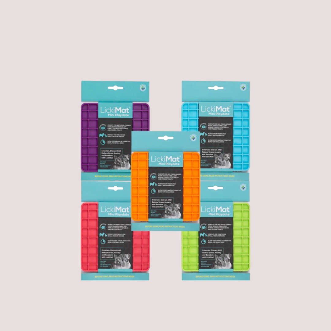 Spread your pet’s favourite soft food, pâté, peanut butter (xylitol-free), or yoghurt across the surface of the LickiMat Playdate Mini. Supervise use to ensure safe enjoyment.