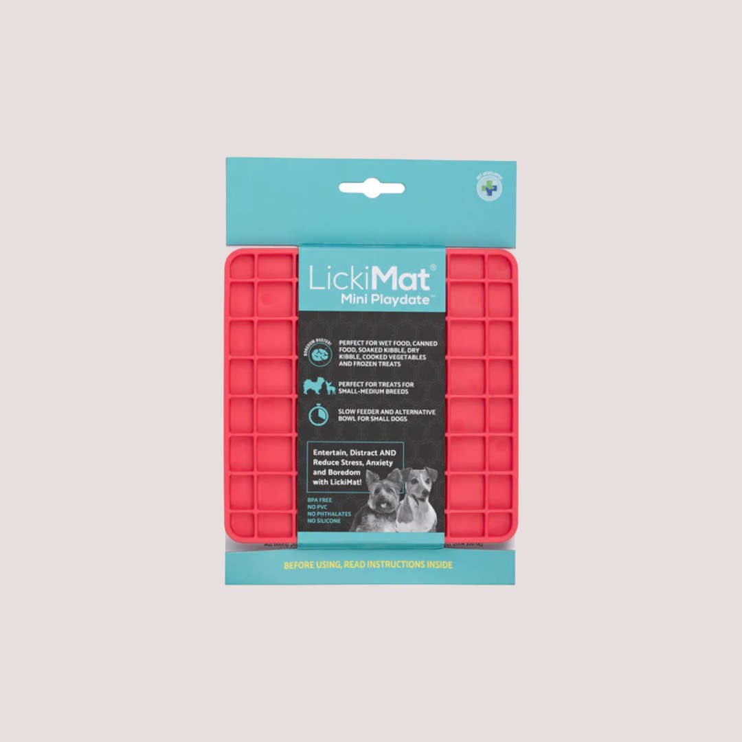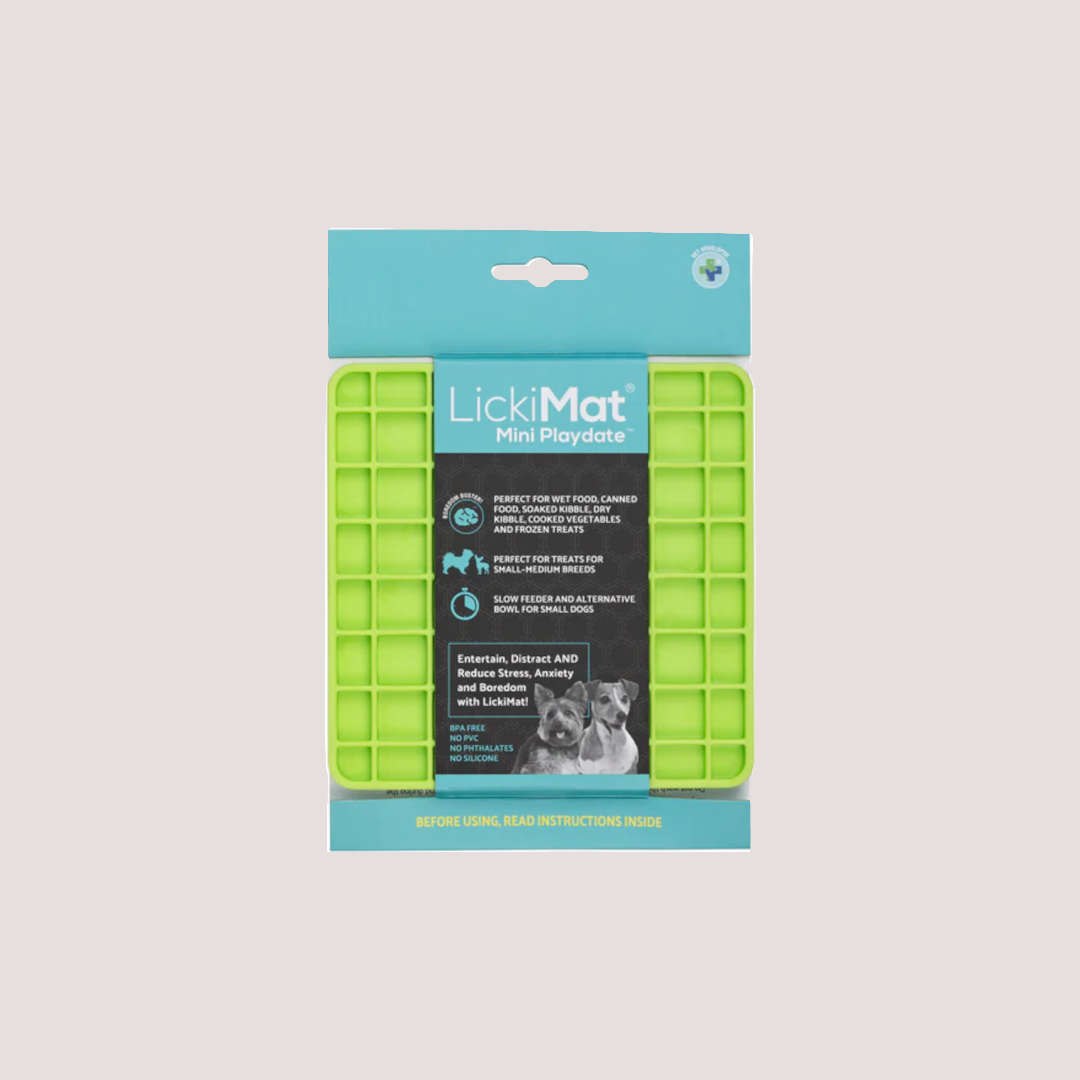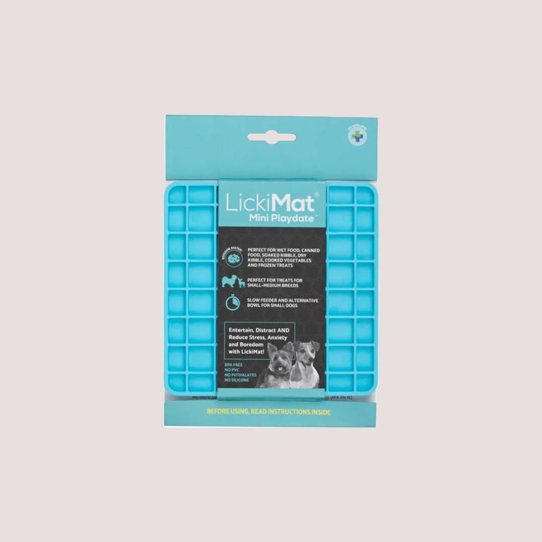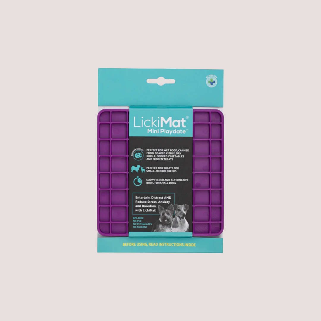 LickiMat Playdate Mini is a stimulating puzzle feeder designed for both cats and dogs. Its unique textured surface encourages pets to lick, which can help release endorphins that promote relaxation and calm. Perfect for stressful times such as vet visits, grooming, or during thunderstorms and fireworks.