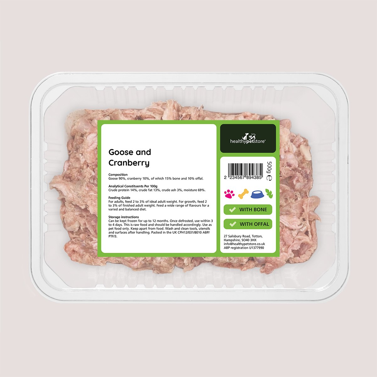 Healthy Pet Store’s Raw Minced Goose & Cranberry With Bone & Offal 500g is a single-protein raw meal with a seasonal twist. Made from 90% goose, including 10% bone and 10% offal, and 10% cranberry, this recipe offers a flavourful and nutritional option for dogs following a raw diet.
