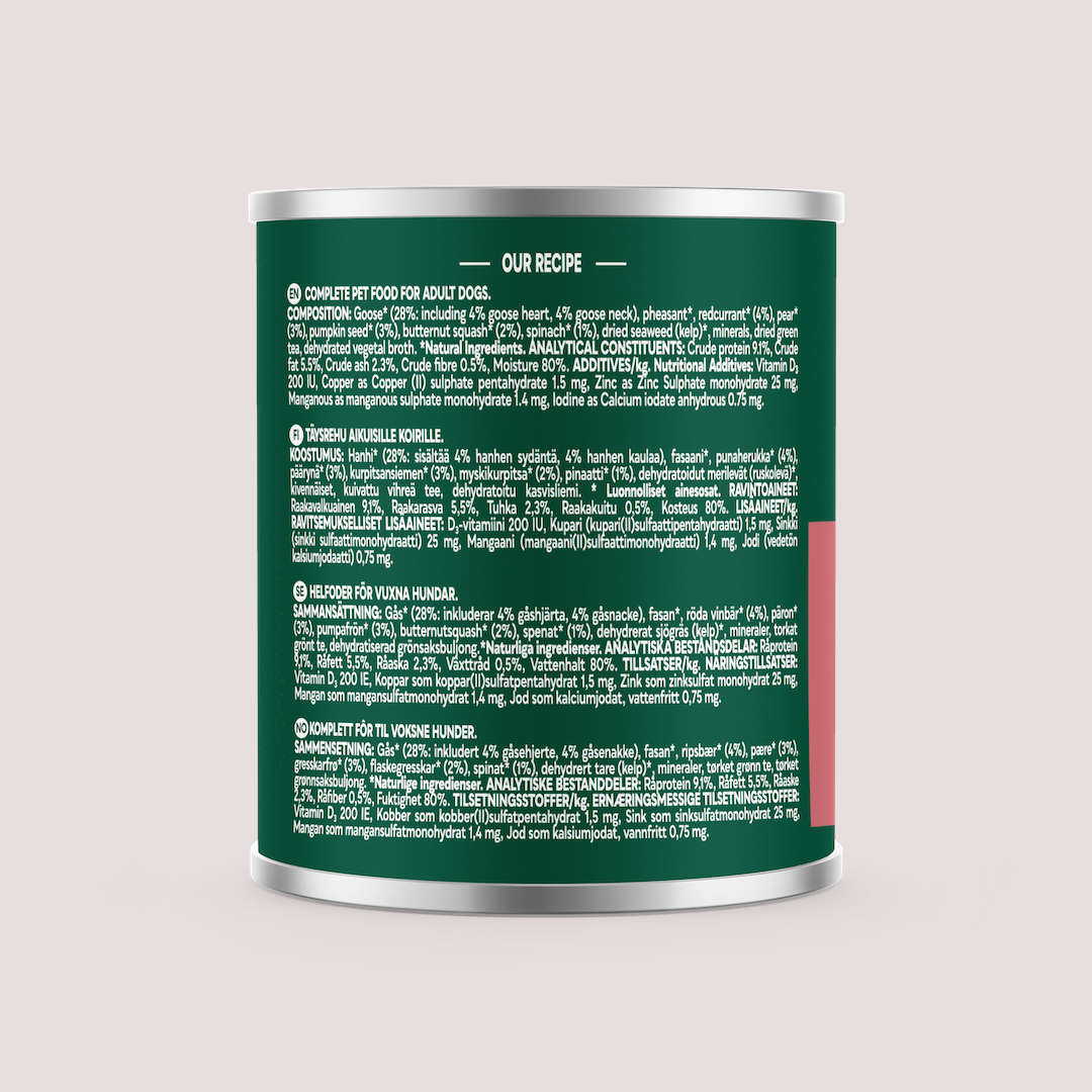 Goose 28% (including 4% heart, 4% neck), pheasant 27%, redcurrant 4%, pear 3%, pumpkin seeds 3%, butternut squash 2%, spinach 1%, minerals, dehydrated vegetal broth, green tea extract.