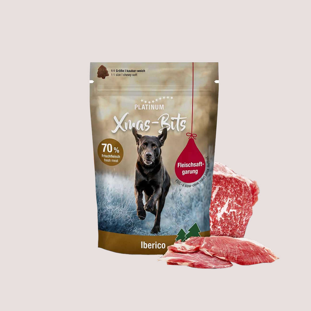 Platinum Christmas Iberico Pork Click Bits are gently made without unnecessary fillers, ensuring a wholesome snack that supports vitality while celebrating the joy of Christmas with your dog.