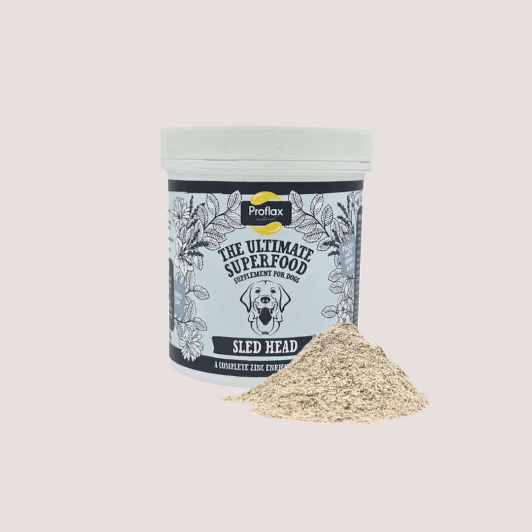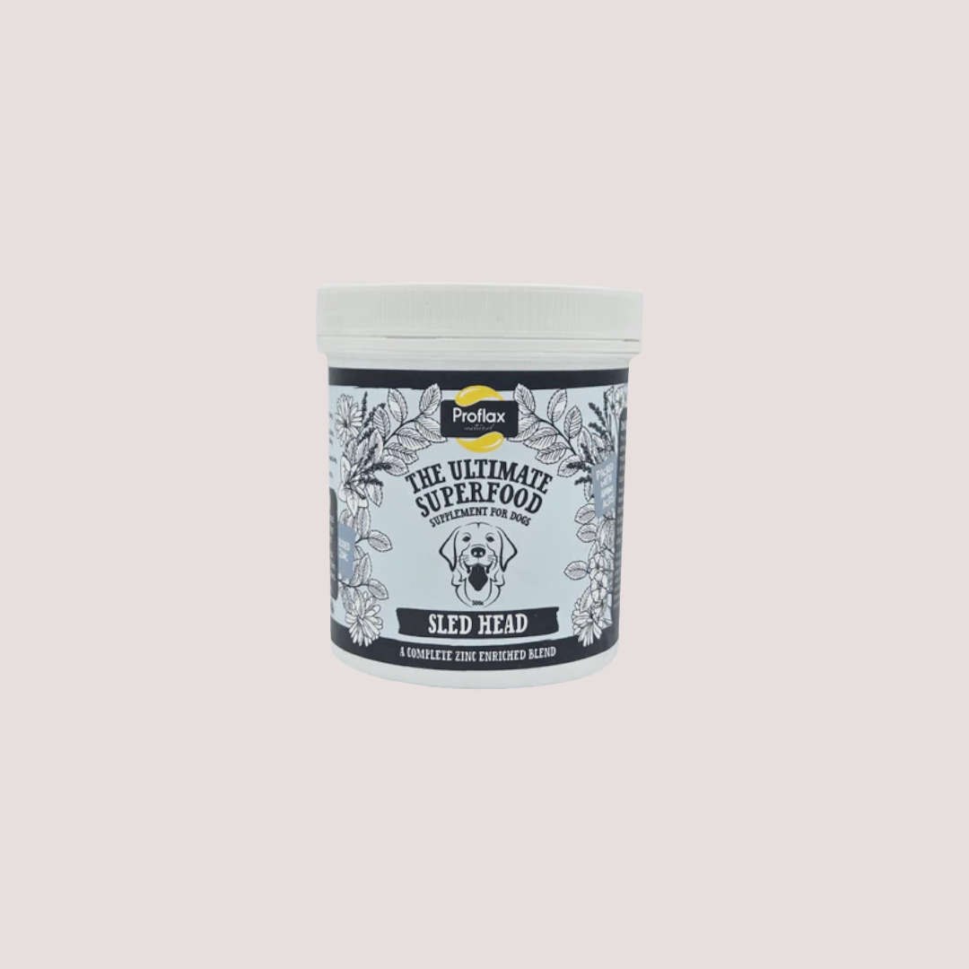 Proflax Sled Head is a powerful natural herbal powder blend formulated specifically for dogs that struggle with zinc absorption. It provides a carefully balanced source of bioavailable zinc, supported by botanicals, amino acids and targeted nutrients to help maintain healthy skin, coat condition, digestion, joints and overall vitality.