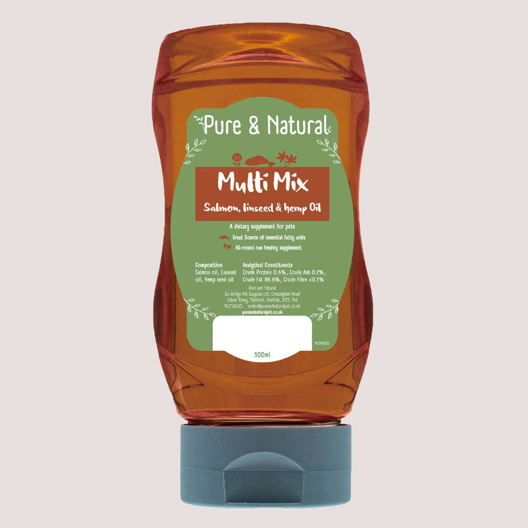 Pure & Natural Salmon Linseed & Hemp Oil Multi Mix is a premium oil supplement designed to support your dog’s skin, coat and overall health. Combining nutrient-rich salmon oil with linseed oil and hemp seed oil, this balanced blend provides a natural source of essential omega fatty acids that help maintain healthy skin, promote a glossy coat and support general vitality.