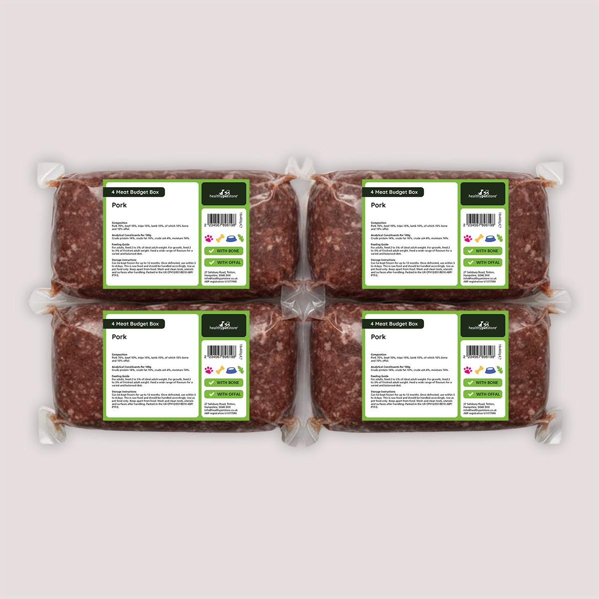 Healthy Pet Store’s Raw Budget Box Minced Pork 18x400g is a cost-effective way to support your dog’s raw feeding routine, made using an 80:10:10 ratio of meat, bone and offal. This mixed-protein recipe includes pork, beef, tripe and lamb, providing essential nutrients, natural fats and a flavour dogs love.