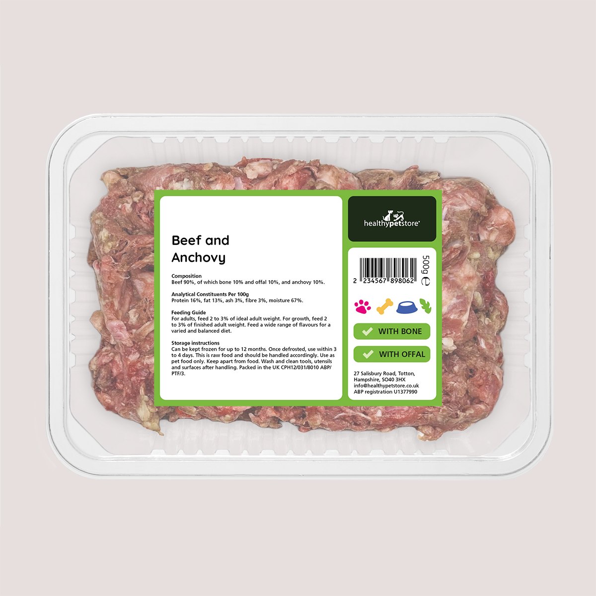 Raw Minced Beef & Anchovy 500g is a wholesome, protein-rich raw meal combining quality beef with nutrient-dense anchovies. The inclusion of bone and offal provides a natural source of essential minerals, while the anchovy adds omega fatty acids to support healthy skin, joints, and coat condition. This blend is ideal for dogs following a raw or BARF diet and contains no grains, fillers, or artificial additives. Pure, natural goodness to keep your dog healthy and energised.
