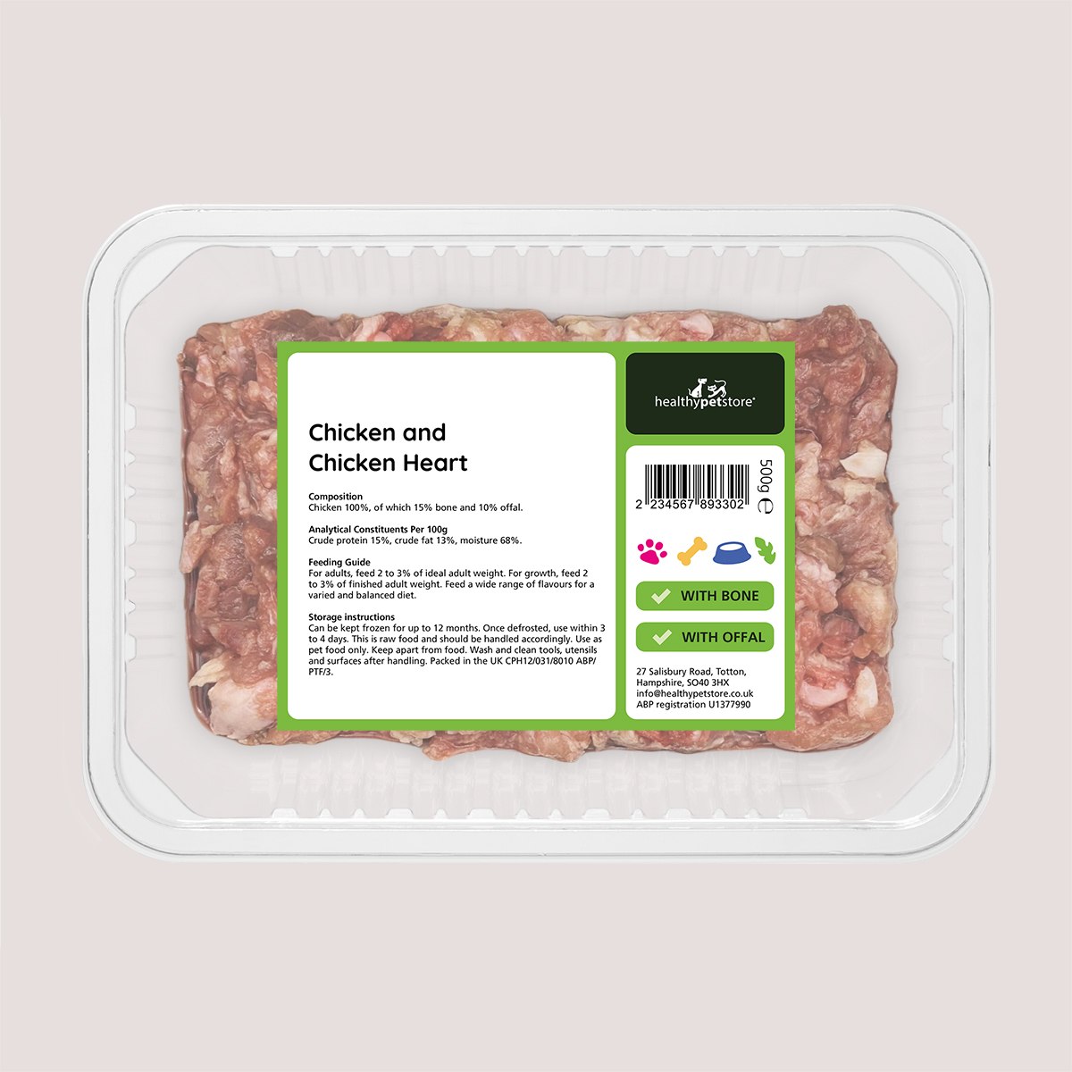 Healthy Pet Store Raw Minced Chicken & Heart With Bone & Offal is a high-quality raw food crafted to meet your pet’s natural dietary needs. This recipe features 50% chicken and 50% nutrient-rich chicken heart, combined with an 80:10:10 ratio, 80% meat, 10% bone, and 10% offal, to deliver essential nutrients for energy, digestion, and muscle development.