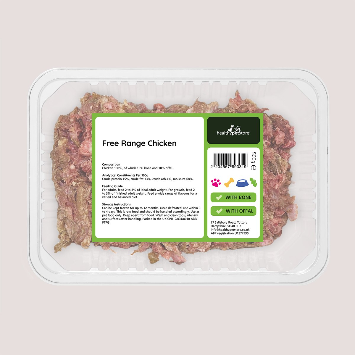 Healthy Pet Store Raw Minced Chicken & Heart With Bone & Offal is a premium raw food crafted with 100% free-range chicken, providing high-quality nutrition for your pet. This 80:10:10 recipe. It delivers essential nutrients to support healthy digestion, strong muscles, and sustained energy.