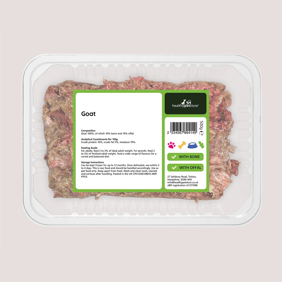 Raw Minced Goat With Bone & Offal 500g from Healthy Pet Store offers a single-protein raw meal crafted to support your dog’s wellbeing with simplicity. This recipe features 100% goat, including 10% bone and 10% offal, delivering the biologically appropriate 80:10:10 ratio for raw feeders.