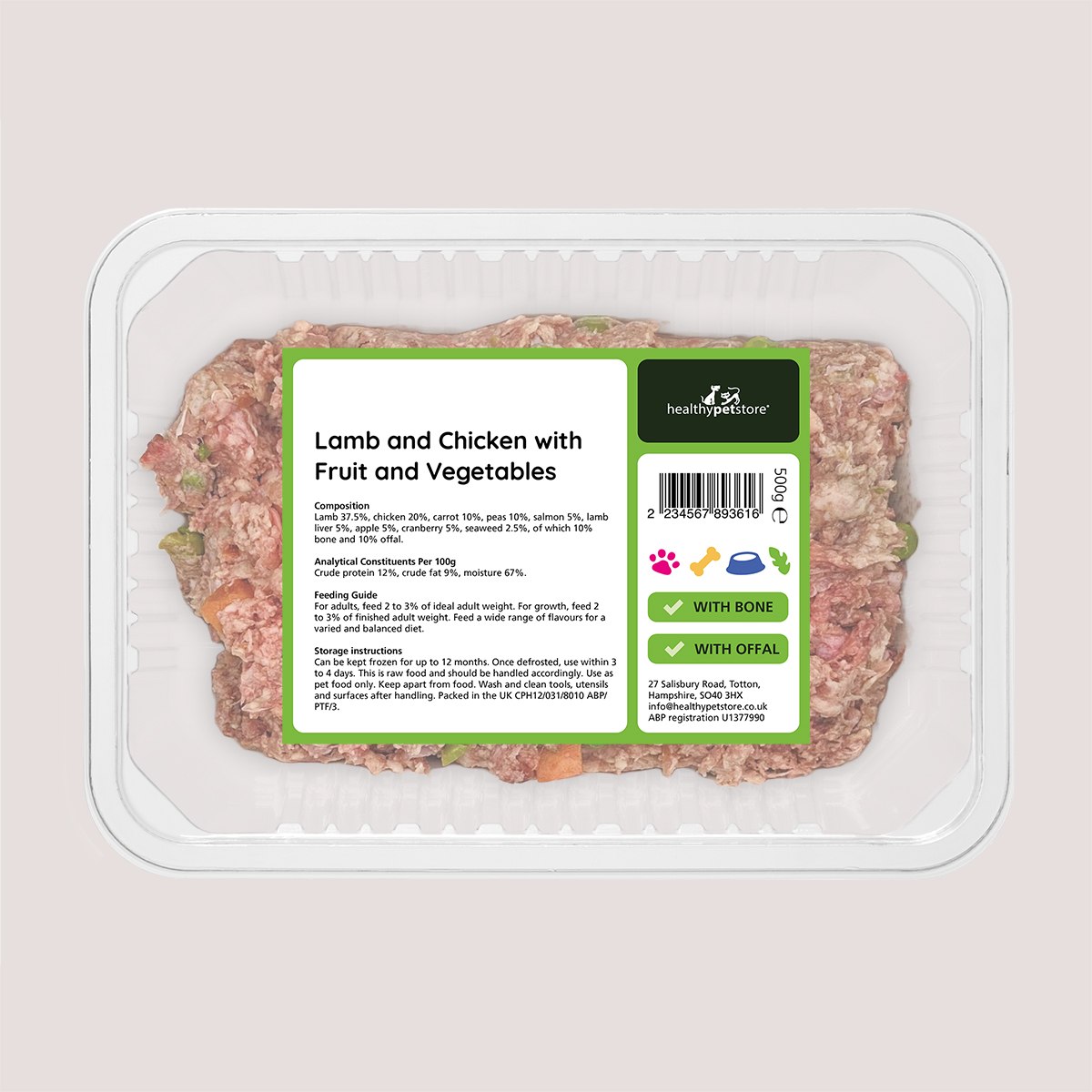 Healthy Pet Store Raw Minced Lamb & Chicken With Vegetables & Fruit With Bone & Offal is a carefully crafted raw food, providing essential nutrition with a 80:10:10 ratio—80% premium meat, 10% bone, and 10% offal. Featuring a blend of lamb and chicken, complemented by vegetables like carrots and peas, and fruits including apple and cranberry, this meal offers a rich and diverse nutritional profile to support your pet’s overall health. Added salmon and seaweed further enhance its nutritional benefits with omega fatty acids and vital minerals.