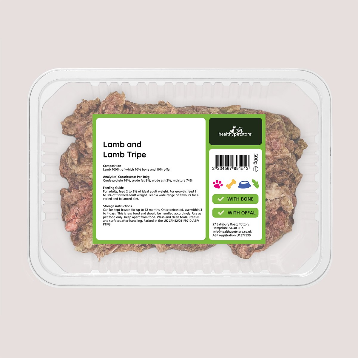 Healthy Pet Store Raw Minced Lamb & Tripe With Bone & Offal is a nutrient-rich raw food blend made entirely from lamb. This mix includes bone, offal and 50% tripe, providing your pet with a source of protein, natural fats, and essential vitamins and minerals.