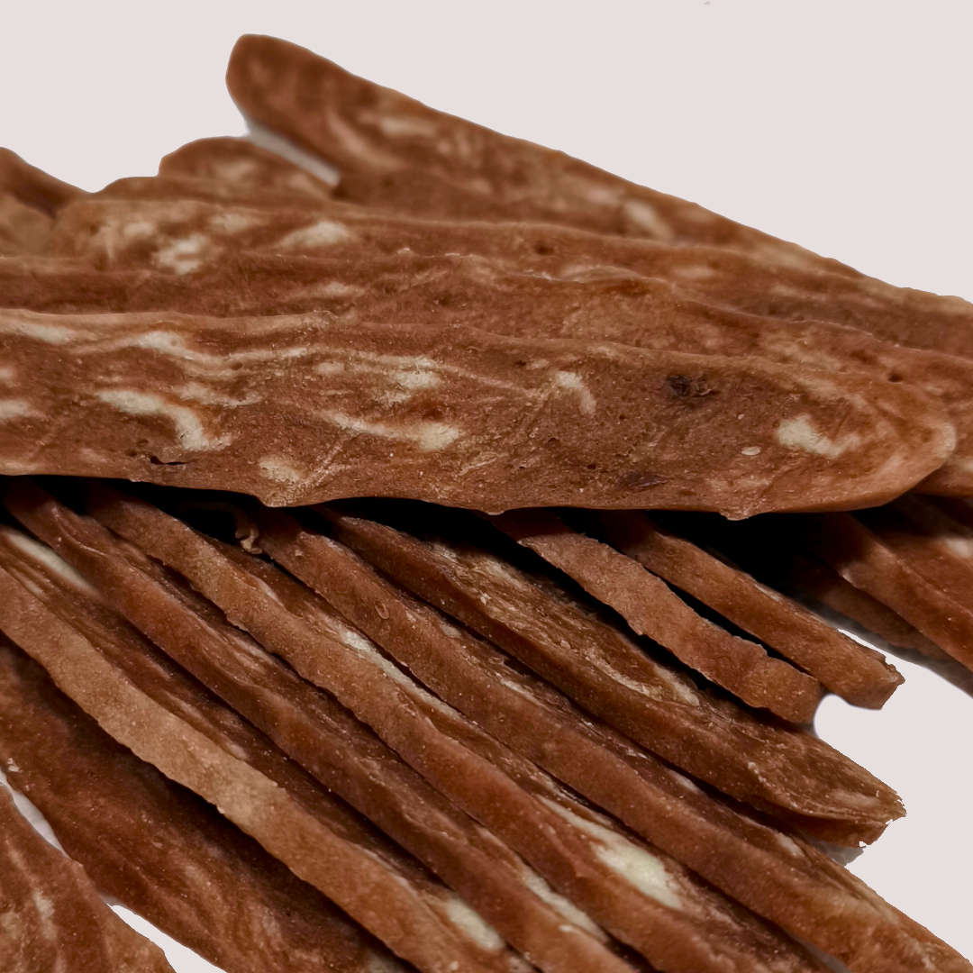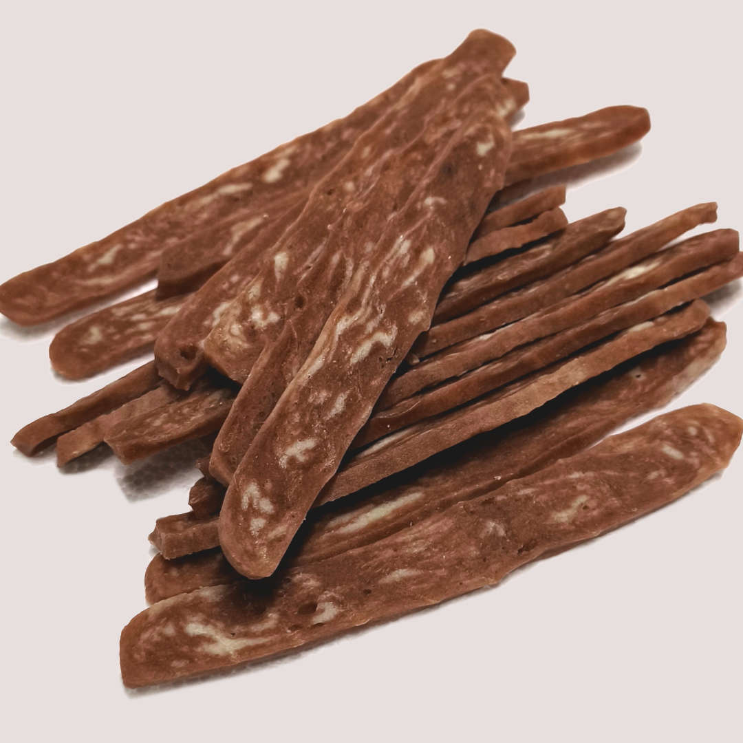 Salmon Marbled Strip made with real salmon, cartilage, and cod – a soft, nourishing treat designed to support skin and coat health, joint mobility, and natural energy. Measuring approximately 12 x 1.5 x 0.4 cm, each strip offers a chewy, flexible format that’s easy to portion or serve whole, depending on your dog’s needs.