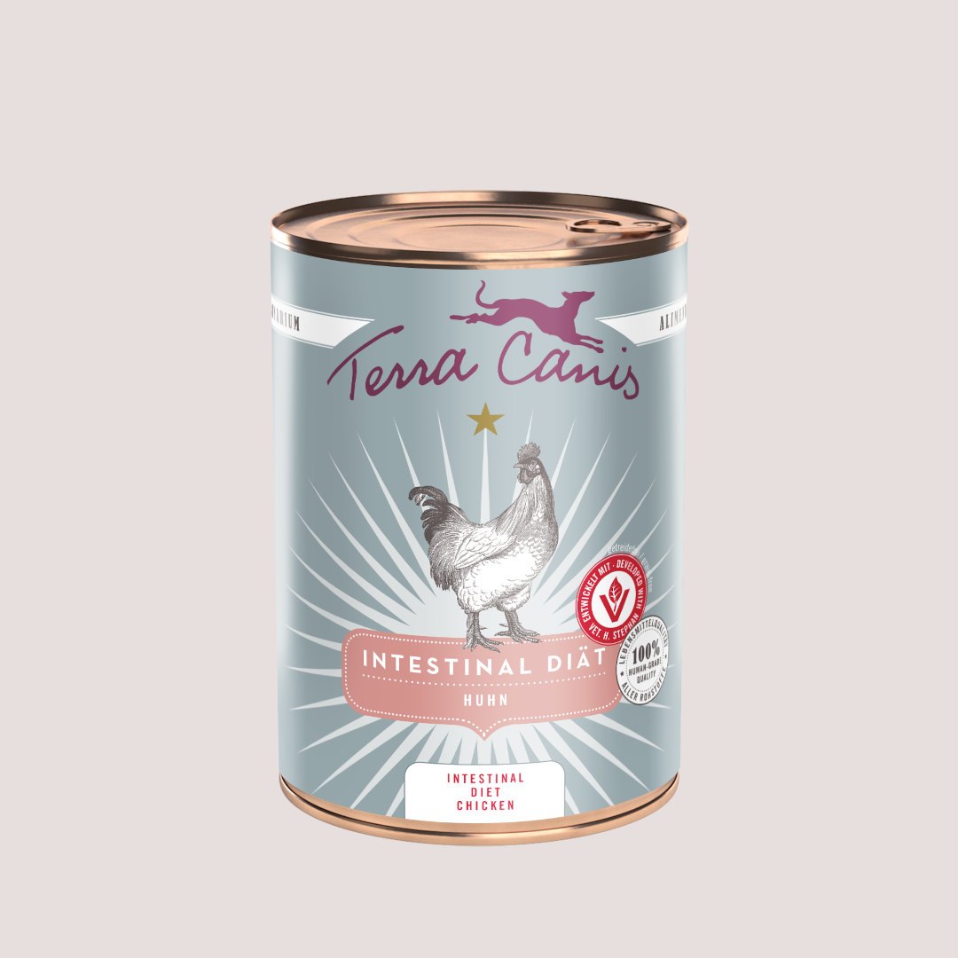 Terra Canis AliVet Intestinal Chicken is a complete, veterinary-developed wet food tailored for dogs with digestive issues or sensitive stomachs. This gentle recipe features high-quality chicken muscle meat and stomachs, combined with soothing vegetables and prebiotic-rich herbs like chamomile, yarrow, caraway, and psyllium husk to support intestinal balance.