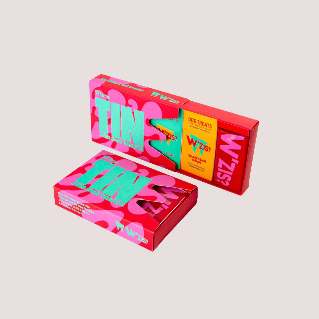 The W’zis Pop Tin Gift Box is a playful and nutritious treat selection made with 100% natural ingredients. Each flavour is crafted for maximum taste, with no artificial additives, making it a safe choice for sensitive dogs.