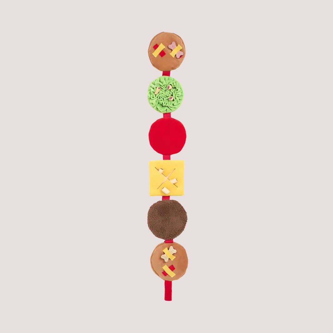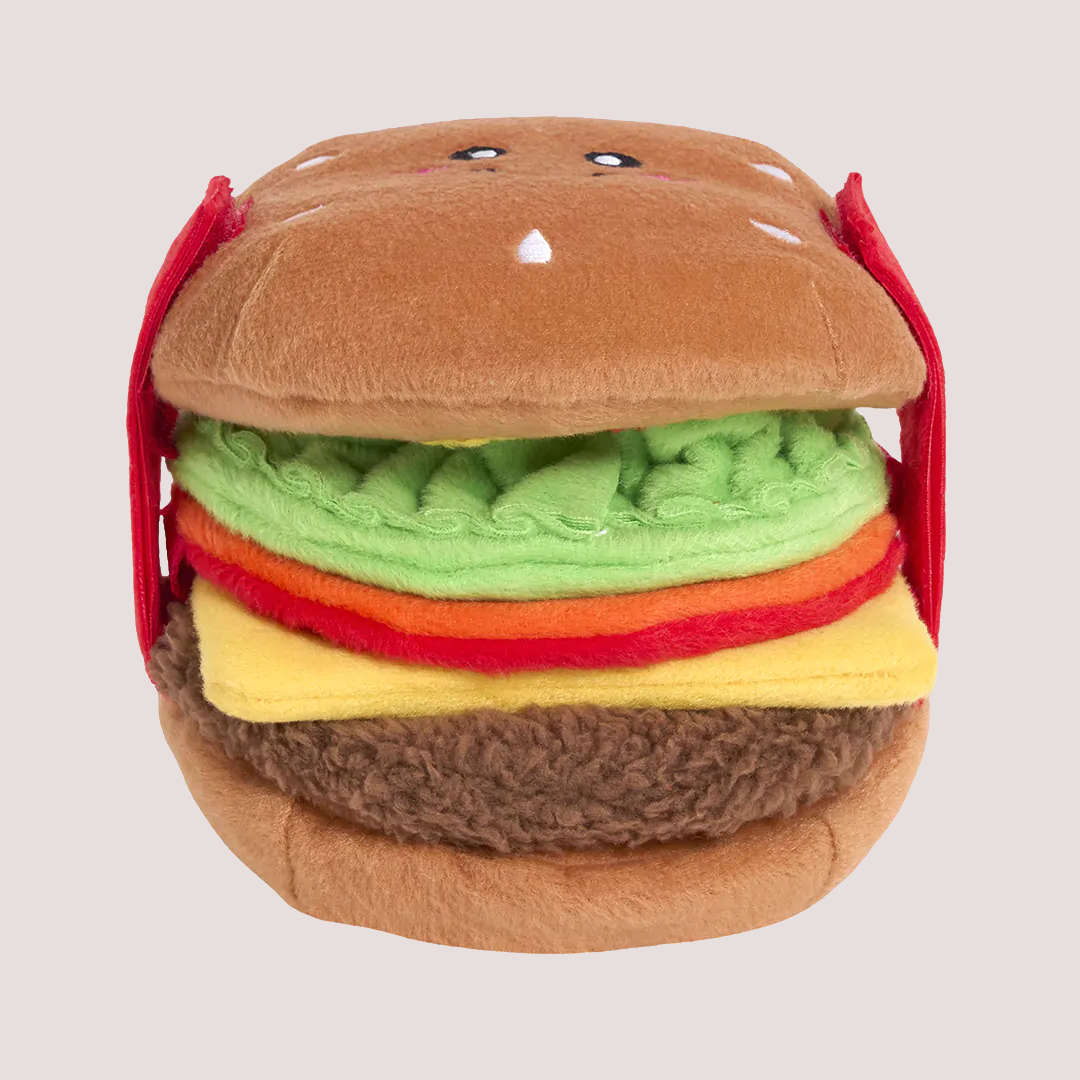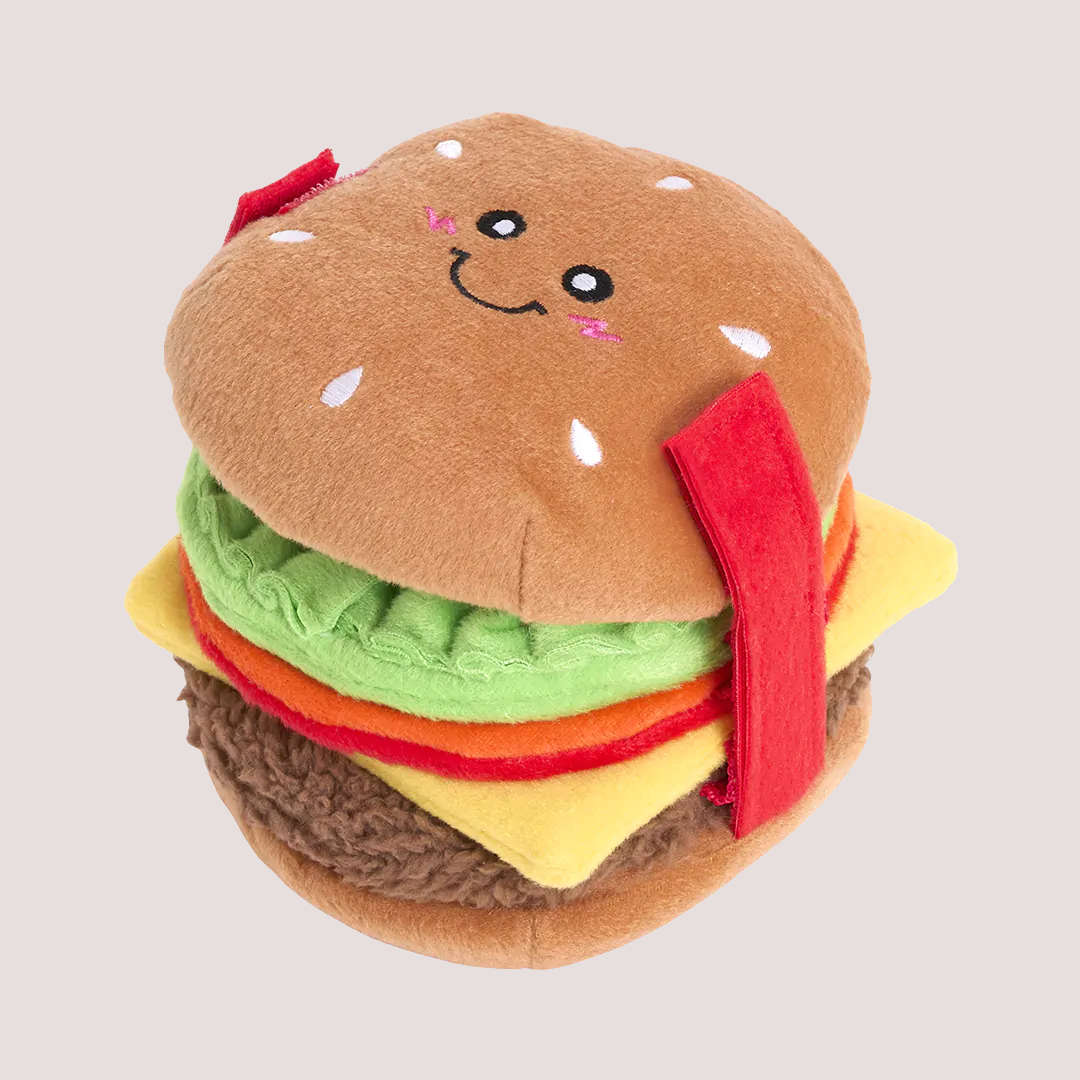• Cheeseburger-inspired design with multiple treat hiding spots